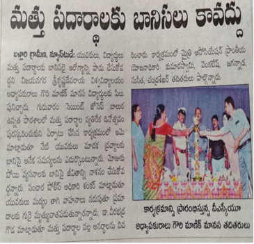 The Purpose of programme was to create awareness among the people and the society, in general regarding ill effects of addiction, and to encourage the persons who are interested to quit the pat of addiction forever. As Chief Guest Given information about the use of Tobacco related and Alcoholism ailments and survival of life, also explained about prohibition about smoking, which leads to dangerous aliments. Dr Gouri Manik Manasa, Associate Professor VSKU Ballari Given Lecture to advise the Program Alcoholism is Mental, Social, and physical effect on Human life. Sri Shankar Inspector Traffic station Ballari Given lecture to patients Drink A lot of accidents have resulted in today’s young generation drunk and Drive so many innocents are losing their live. Dr. Veerabhadra Gouda Chief Medical Officer, Maitri Integrated Rehabilitation Centre for Addicts, Bellary. Given lecture to patients, advised patients and public not to in touch with bad habits like, chewing of tobacco, smoking, alcoholism and use of Drugs. In the group of audience many more handbills distributed, shown slide show about bad effects on brain, heart, lungs of human beings, Many posters have been exhibited most of the Public have promised to live up use of tobacco based product & Drugs. Chief Guest, President and social worker have expressed their happiness about the program organized by the centre. At the end National Anthem Was Conducted.